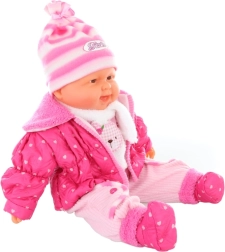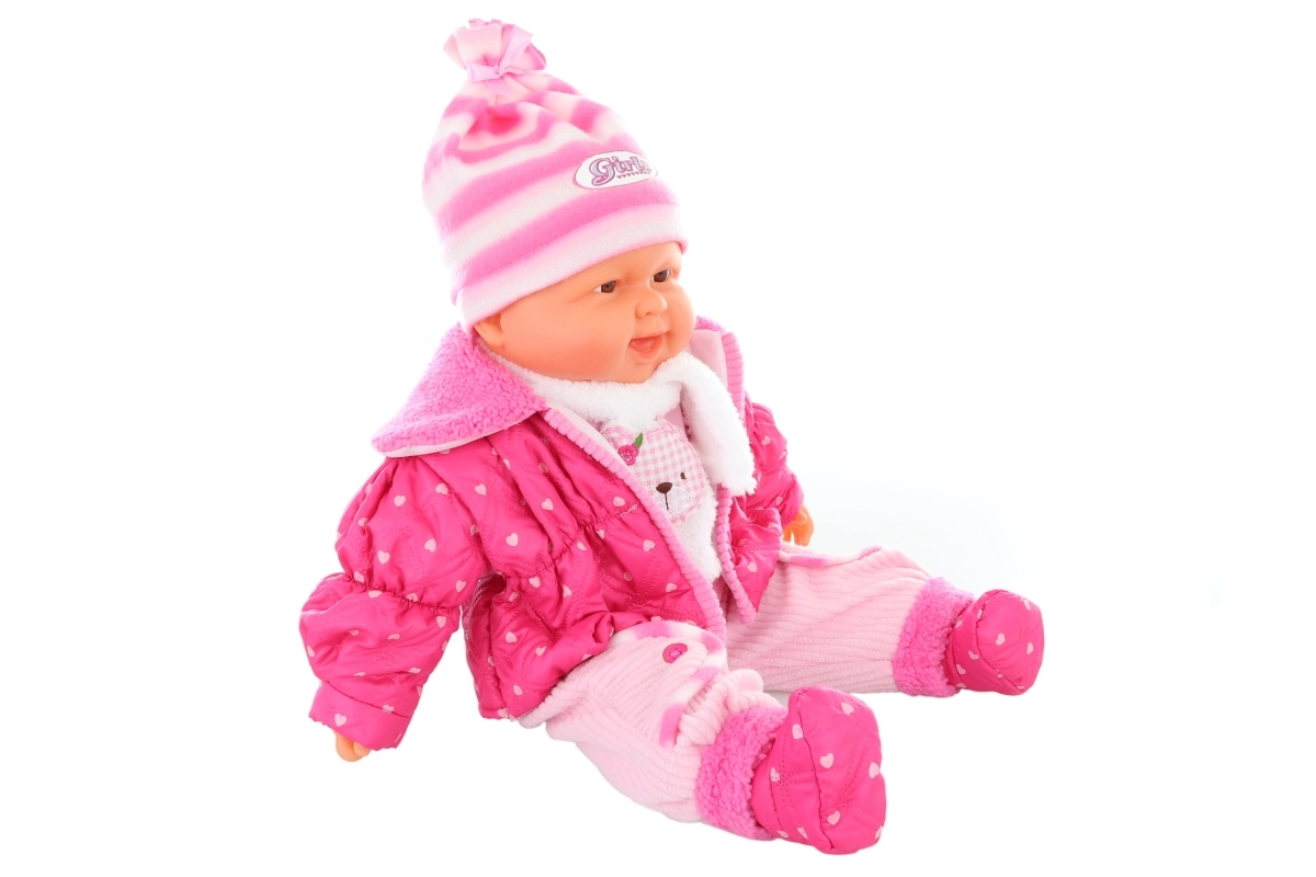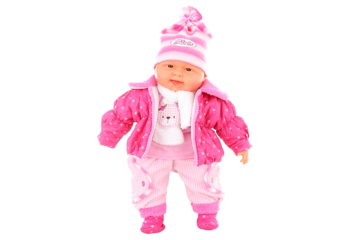 Panenka má detailně zpracovaný obličej a kvalitní textilní oblečení v růžových tónech, vhodné pro každodenní hraní i jako dárek. Velikost cca 52 × 30 × 13 cm zaručuje pohodlné držení i pro menší dětské ruce.