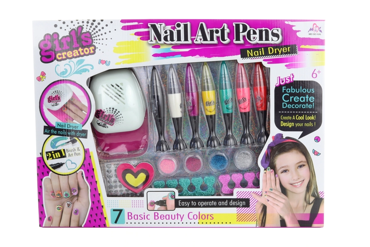 Vytvořte si doma nehtové umělecké dílo s kompletní kreativní sadou pro malé stylistky. Set obsahuje 7 barevných laků s oboustranným aplikátorem (štěteček a pero), sušičku na nehty na 2× AAA baterie, pilníček, rozdělovače prstů, třpytivé prášky a barevné nálepky. Ideální pro děti od 6 let.