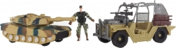 Plastová vojenská sada přináší dětem akční zábavu: obsahuje terénní auto, tank a figurku vojáčka. Tank se pohybuje a vydává zvuky — napájení zajišťují 3 baterie AG13, které jsou součástí balení. Ideální dárek pro malé milovníky armádní techniky od 3 let.