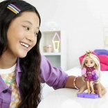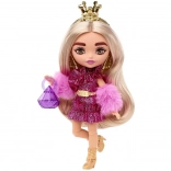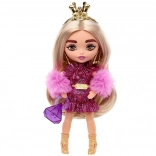Tato malá panenka Barbie Extra je oblečena do blyštivých růžových šatů s volánkem, doplněny o zlatou korunu a fialovou kabelku ve tvaru diamantu.