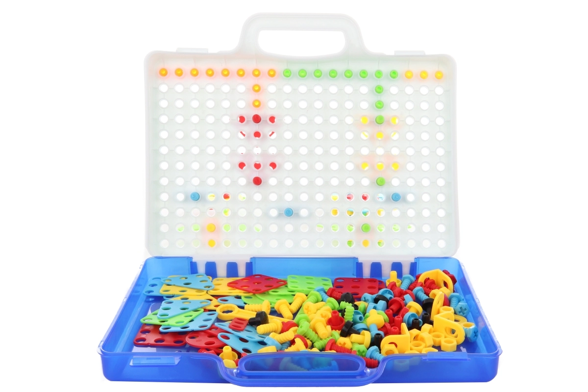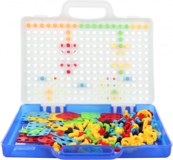 Vše je uloženo v přenosném kufříku s víkem sloužícím jako pegboard, takže se stavebnice snadno přenáší i uklízí. Skvělá pomůcka pro rozvoj motoriky, koordinace oko–ruka, kreativity a trpělivosti.