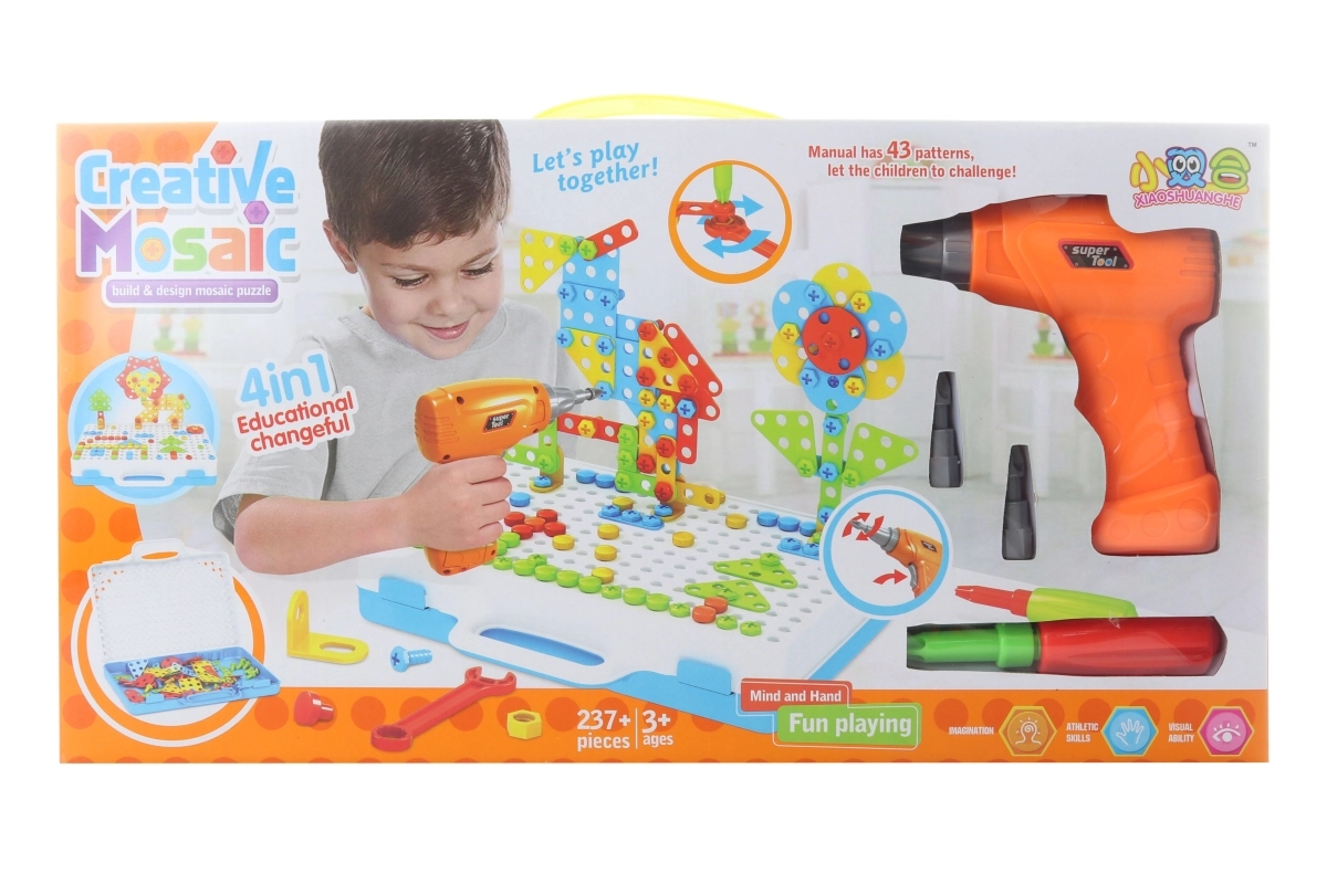 Kreativní šroubovací stavebnice s vrtačkou přináší dětem od 3 let hodiny zábavy i učení. V praktickém kufříku najdete 237 dílků, dětskou vrtačku, šroubovák a návod. Děti si rozvíjejí jemnou motoriku, tvořivost a logické myšlení při stavění barevných vzorů a 3D výtvorů na děrované desce.