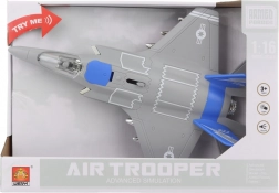 Stíhačka na baterie, která po stisknutí tlačítek vydává zvuky a svítí.