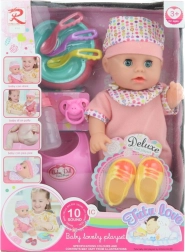 Roztomilá panenka pro děti od 3 let, která po vložení baterií vydává realistické zvuky a umí čůrat. Součástí je bohaté příslušenství včetně botiček, plastového bryndáčku, lahvičky a talířku. Ideální pro nácvik péče o miminko a rozvoj fantazie.
