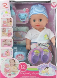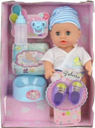Roztomilé miminko o výšce 30 cm potěší každého malého pečovatele. Po vložení baterií vydává realistické zvuky a umí čůrat. Součástí balení jsou botičky, bryndáček, lahvička, talířek a další doplňky pro hraní na maminku či tatínka. Ideální pro děti od 3 let.