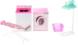 - Obsah sady: pračka (otevírací přední víko), sušička (otevírací horní víko), žehlicí prkno, žehlička pro panenky, stojan na šaty s 5 ramínky, košík na prádlo