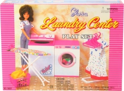 Zábavná a detailní prádelní sada pro panenky GLORIE přináší vše potřebné pro hraní na domácnost: pračka a sušička s otevíracími víky, žehlicí prkno s žehličkou, stojan s ramínky a košík na prádlo. Ideální pro děti od 3 let.