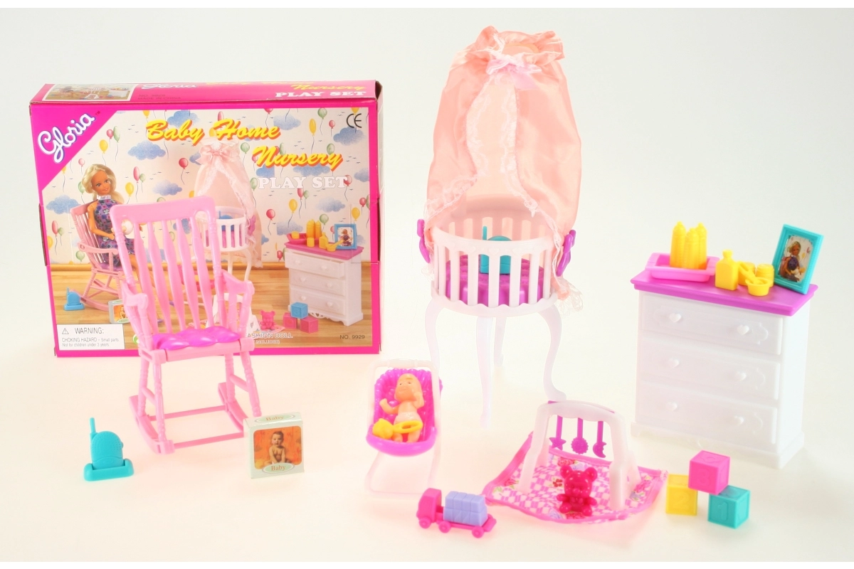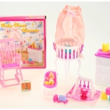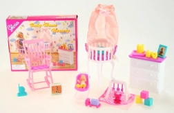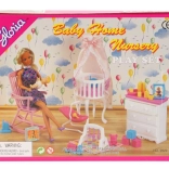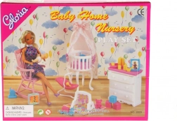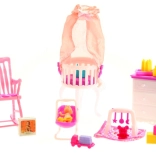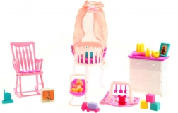 Kompletní sada pro miminko od značky Glorie přináší vše, co dětský pokojíček potřebuje pro hraní s panenkami. Najdete v ní komodu se šuplíkem, postýlku s nebesy, lehátko, houpací křeslo, doplňky pro péči o miminko a samotné miminko. Ideální pro děti od 3 let pro rozvoj fantazie a pečujících dovedností.