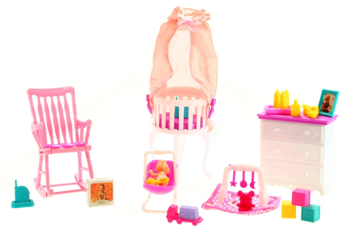- Komoda se šuplíkem, postýlka s nebesy, dětské lehátko, houpací křeslo, dětské hračky a potřeby, chůvička (obrázek), miminko