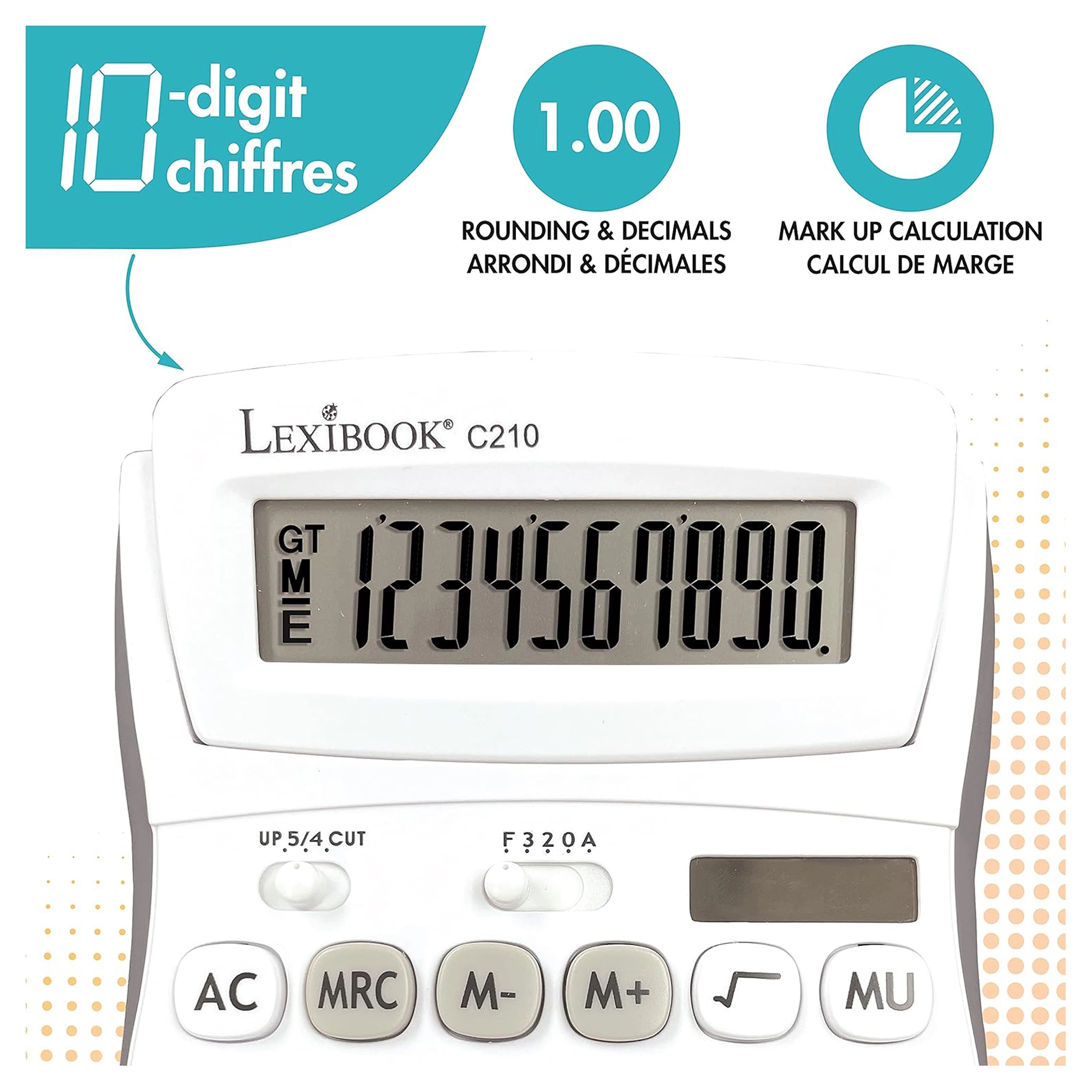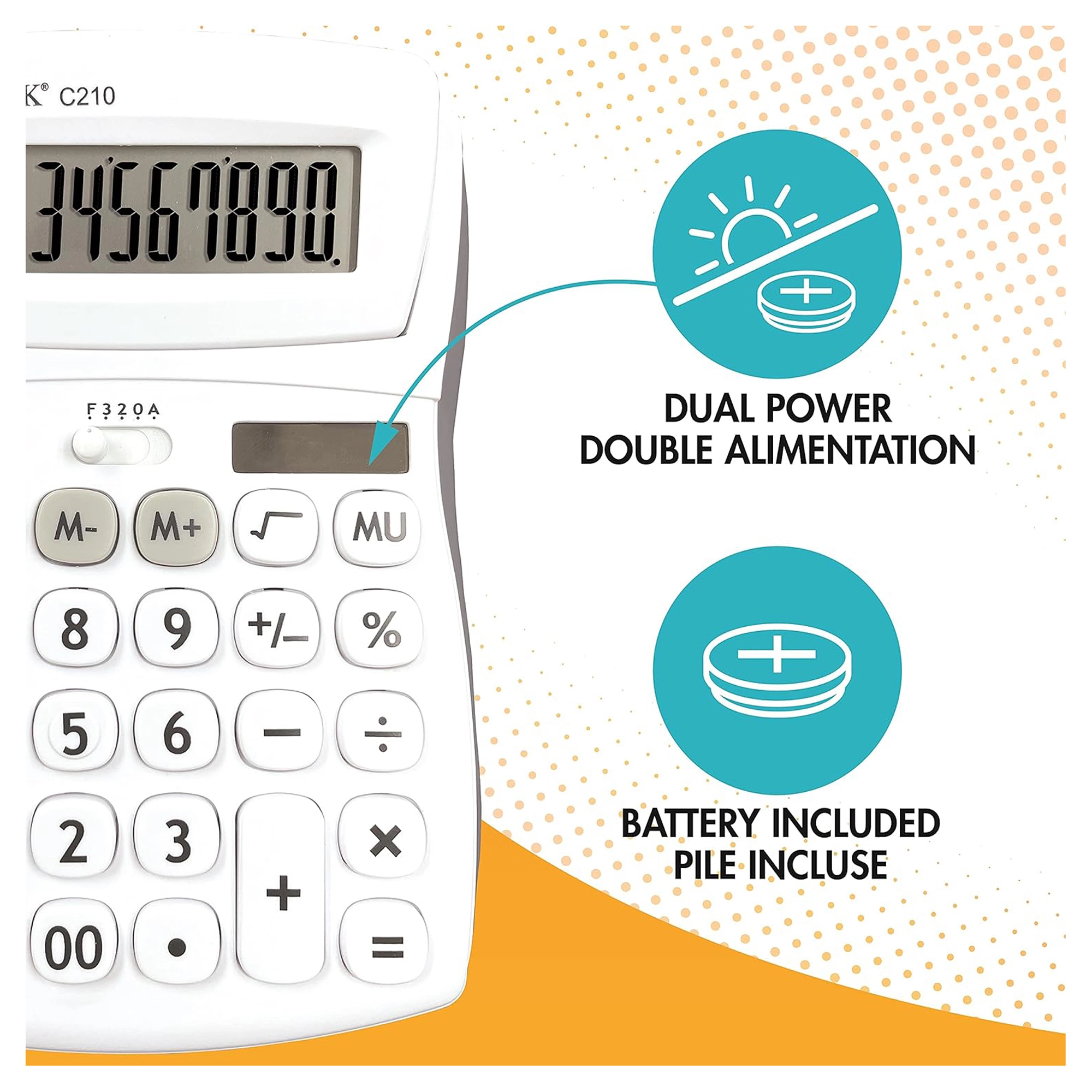 Univerzální stolní kalkulačka s 10místným výklopným displejem, velkými pogumovanými tlačítky a duálním napájením (solární + baterie AG10). Nabízí základní i pokročilé funkce včetně paměti na 3 čísla, procent, odmocniny, výpočtu marže a opravného tlačítka. Ideální do kanceláře, školy i domácnosti.