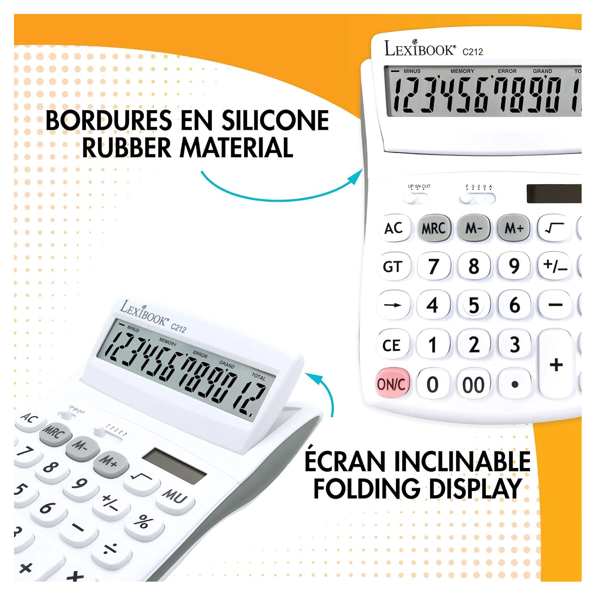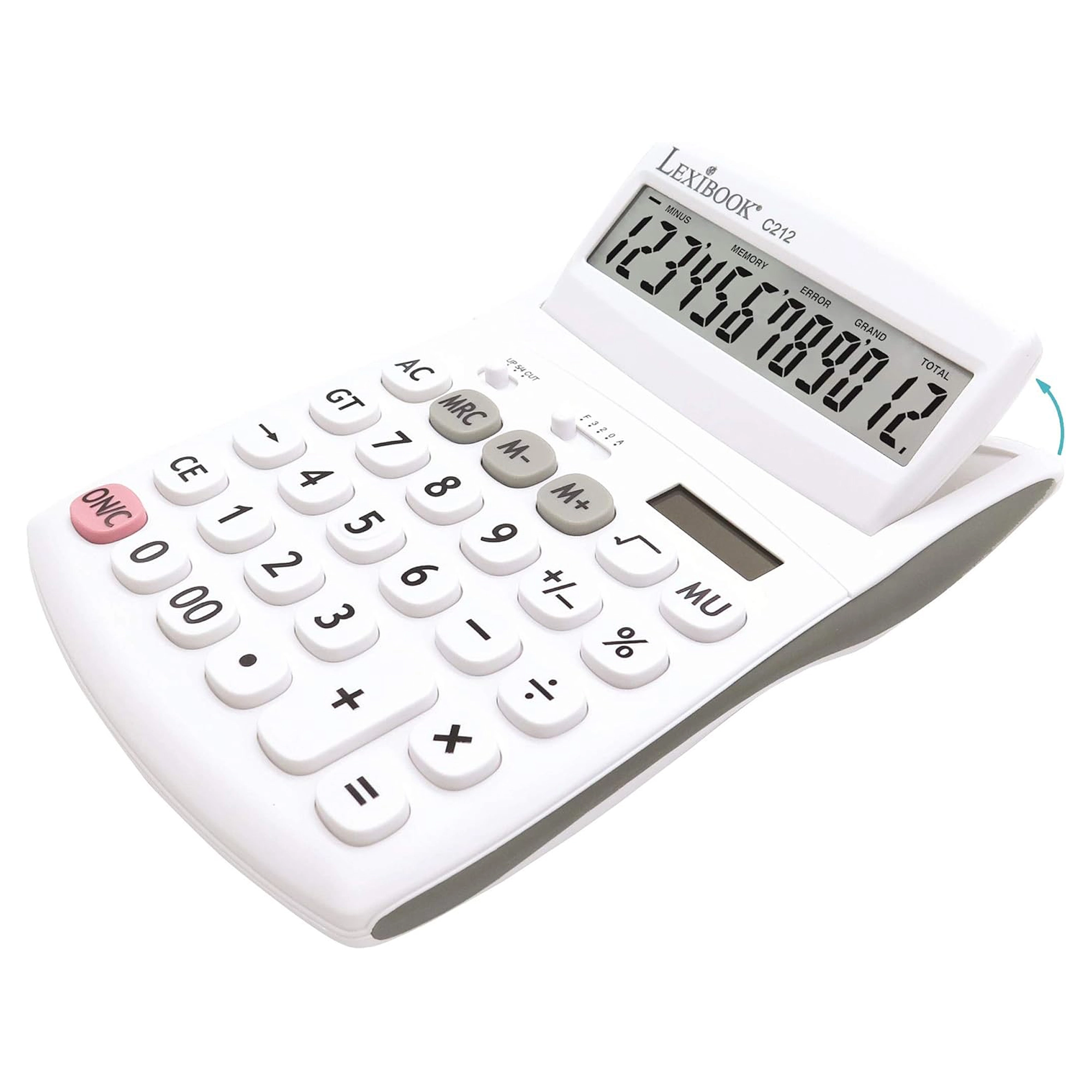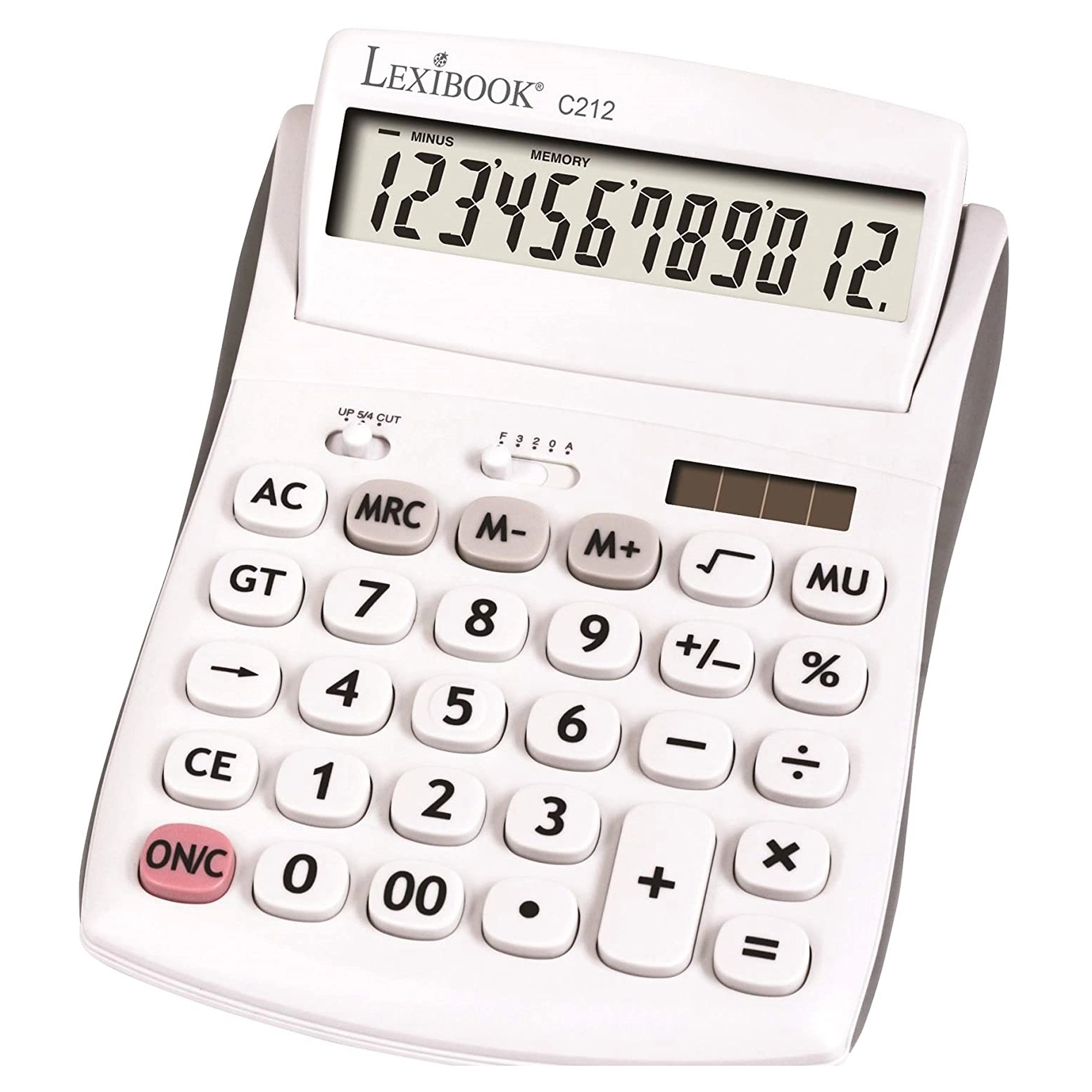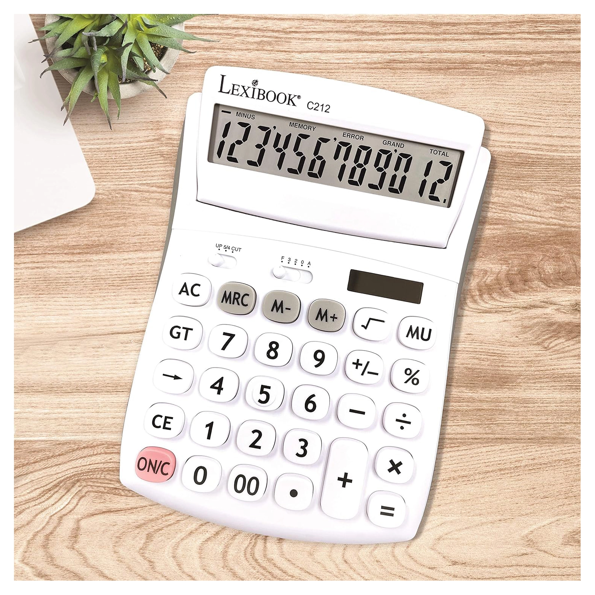 Praktická 12místná stolní kalkulačka pro kancelář, školu i domácnost nabízí velký výklopný displej, odolná pogumovaná tlačítka a duální napájení (baterie AG10 + solární). Umožňuje volbu desetinných míst a zaokrouhlování, má paměť na 3 čísla, funkce procent, odmocniny a výpočtu marže a nechybí opravné tlačítko pro smazání posledních číslic.