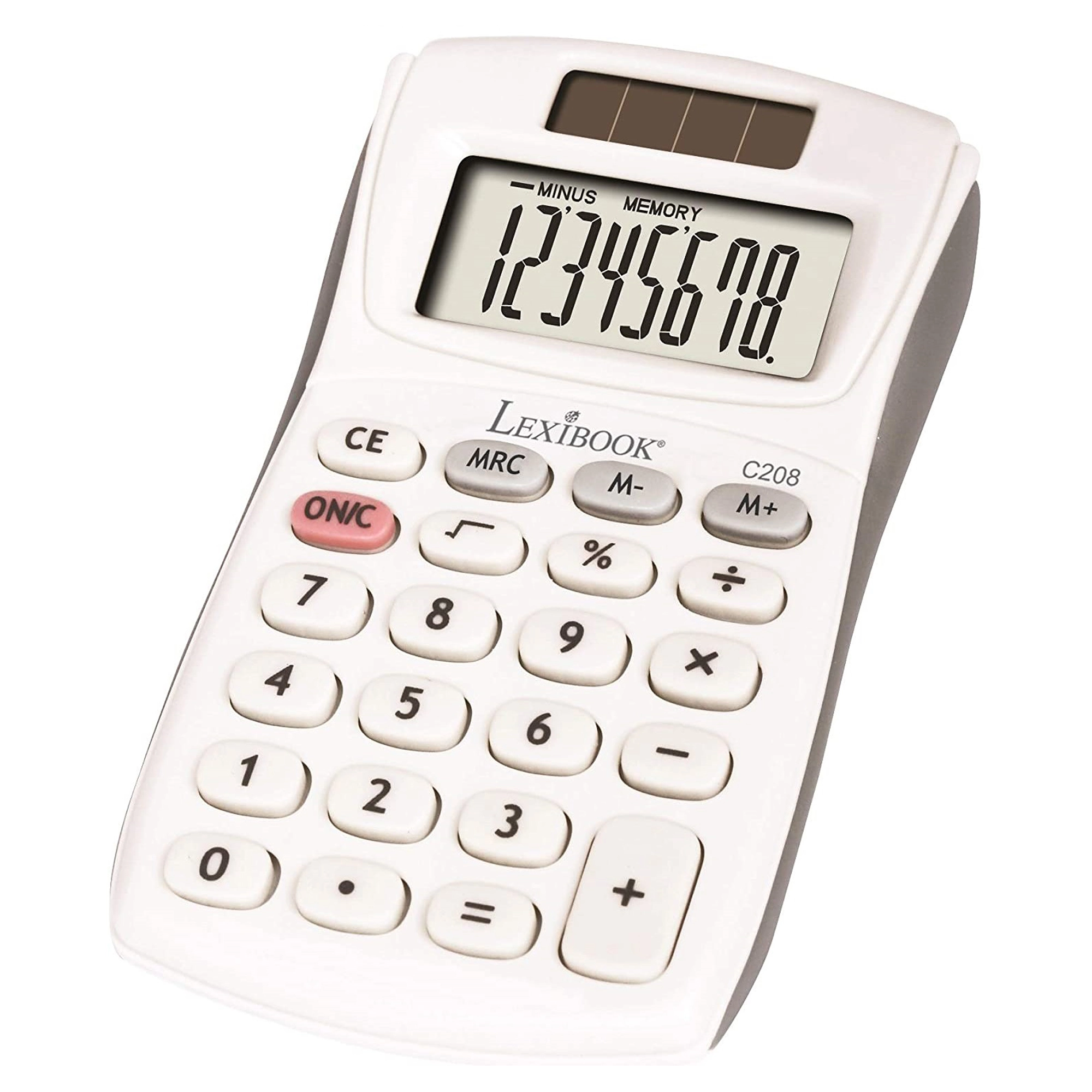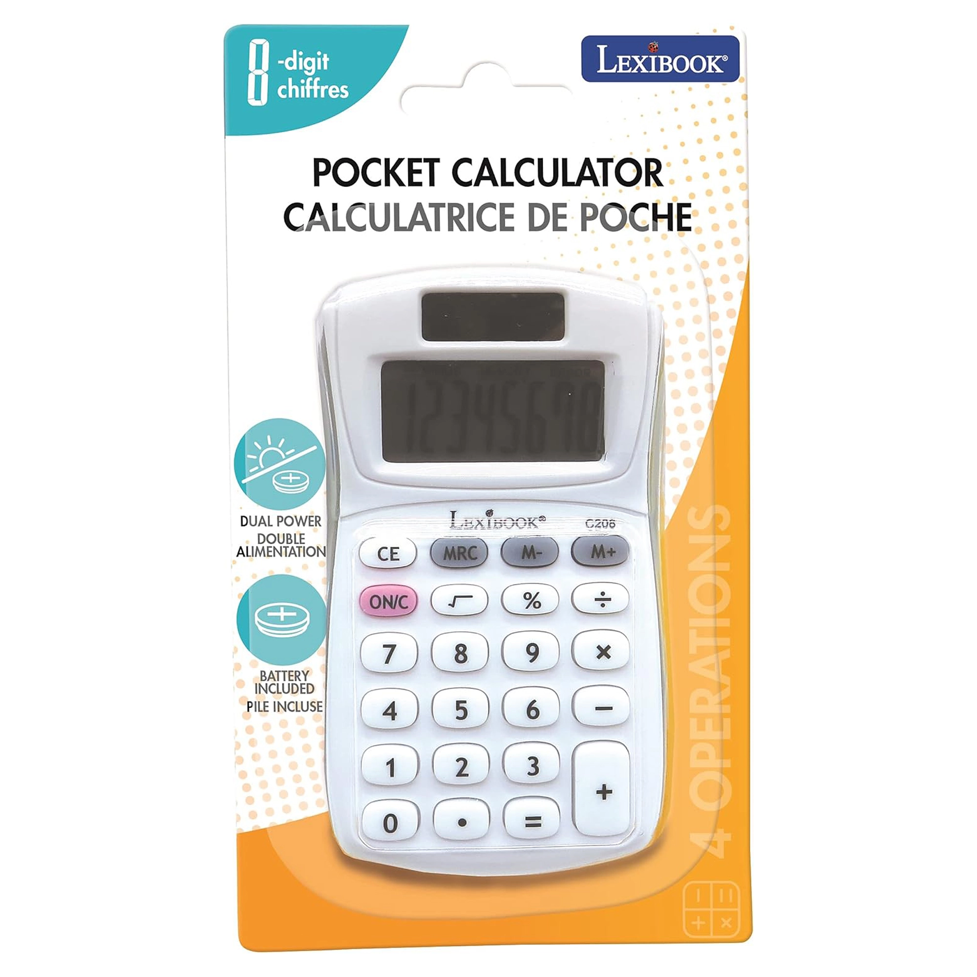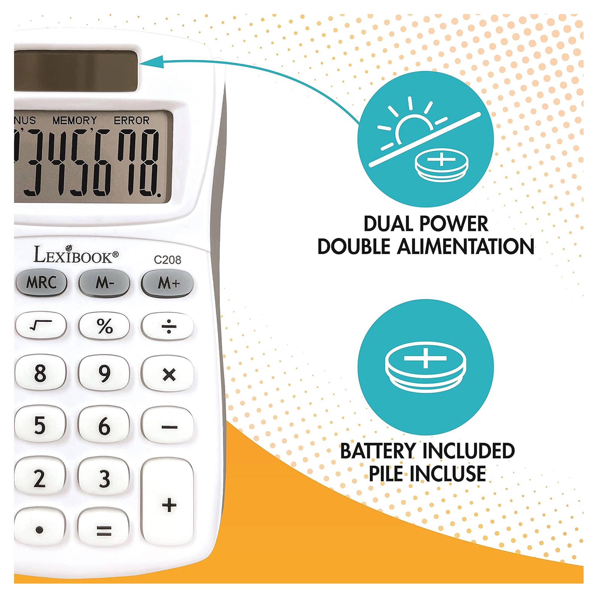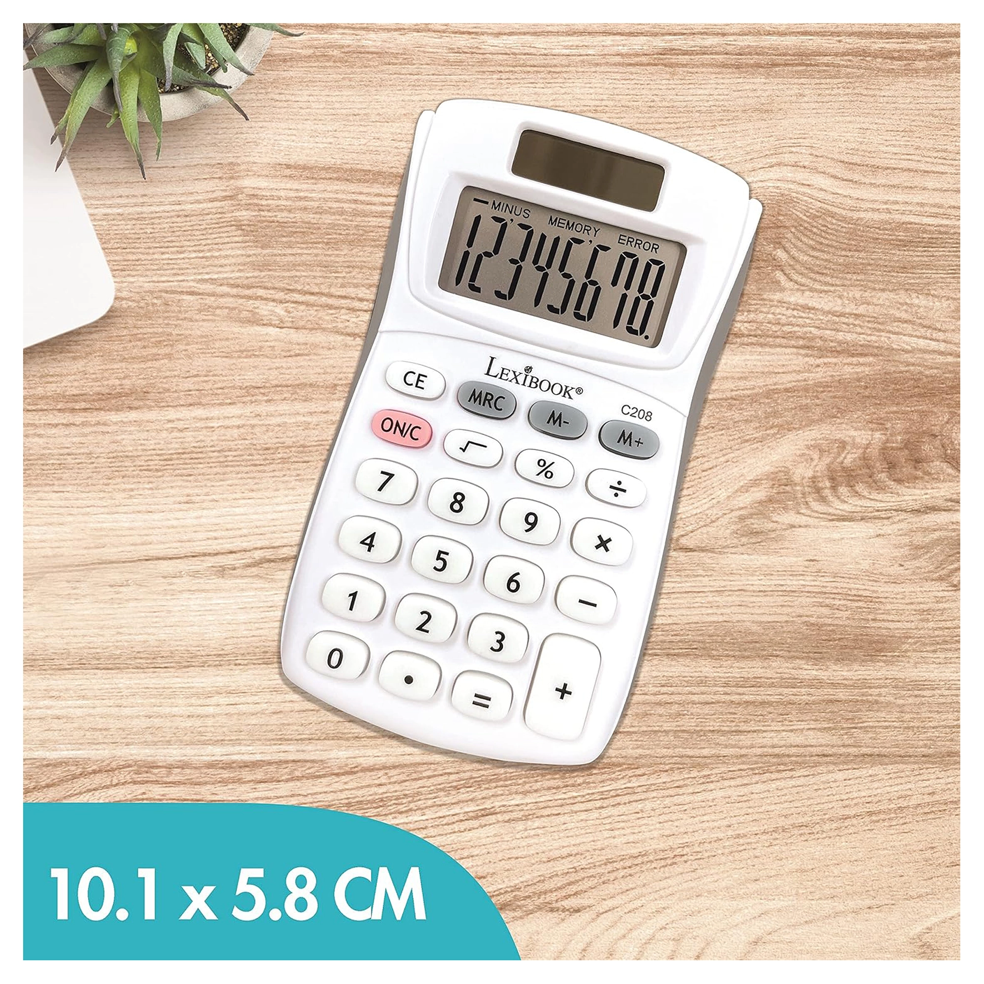 Kompaktní kapesní kalkulačka Lexibook s 8místným displejem nabízí solární napájení se záložní baterií, ergonomický design s pogumovanými okraji a přehledná barevná tlačítka pro pohodlné, rychlé a spolehlivé výpočty ve škole i doma.