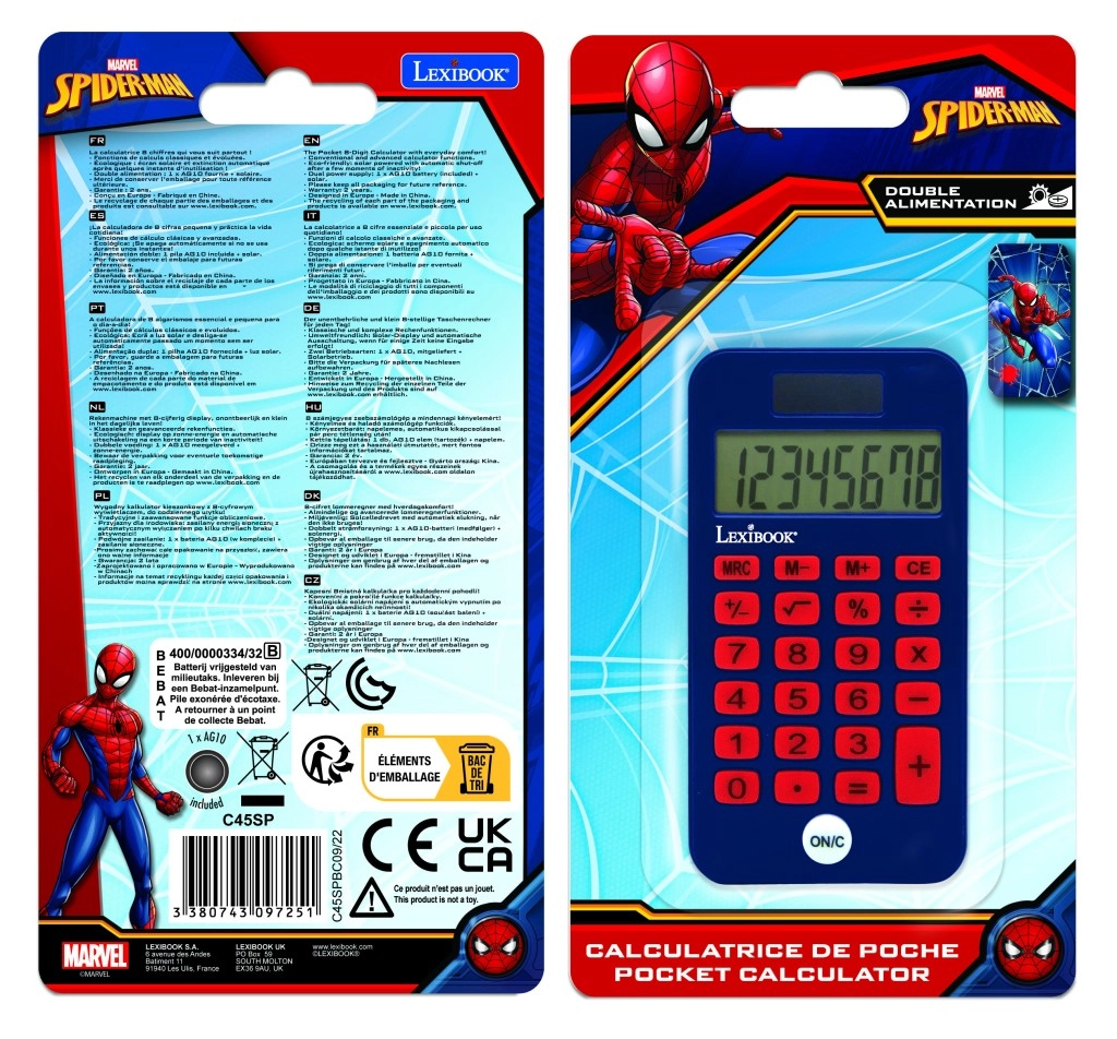 Stylová dětská kapesní kalkulačka s motivem SPIDER-MAN zaujme barevným designem a kompaktní velikostí. Nabízí osmimístný displej, základní i pokročilé funkce včetně procent a paměti (M+/M-/MRC). Díky duálnímu napájení (solární + baterie) je šetrná k životnímu prostředí a má automatické vypnutí. Ochranný kryt zajišťuje bezpečné nošení v batohu.