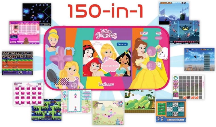 Kapesní konzole DISNEY Princess Compact II Cyber Arcade je skvělý společník na cesty. Nabízí 150 her (140 klasických + 10 tematických), které rozvíjejí postřeh, logiku i kreativitu. Barevný 2,5" LCD displej a nastavitelná hlasitost zajišťují pohodlné hraní doma i venku.