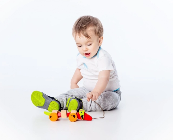 Díky kolečkům a provázku je hračka snadno ovladatelná a děti ji mohou tahat s sebou, kamkoli se vydají.