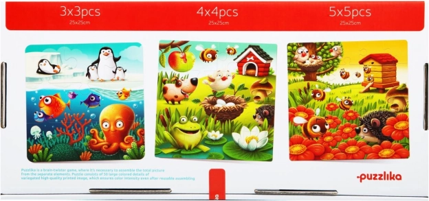 Objevte hravé učení s puzzlem Puzzlika oblíbená zvířátka 3 v 1. Balení obsahuje celkem 50 velkých dílků, ze kterých děti poskládají 3 samostatné obrázky 25 × 25 cm s různou obtížností (3×3, 4×4, 5×5). Díky pestrým motivům zvířat a výrazným barvám je skládání atraktivní a motivující pro děti předškolního věku.