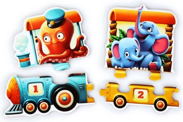 Toto barevné naučné puzzle je navržené pro radostné učení hrou. Každý vagónek tvoří dvojice dílků – na jednom je ilustrace skupinky zvířátek, na druhém odpovídající číslice. Děti tak snadno pochopí princip párování a řazení čísel za sebou.