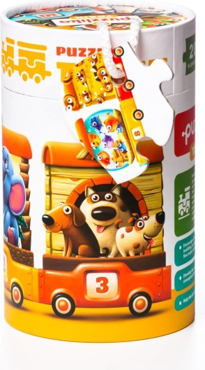 Zábavné a vzdělávací puzzle Puzzlika Vlak pro nejmenší pomáhá dětem učit se čísla 1–10, rozpoznávat zvířátka a procvičovat logické myšlení i jemnou motoriku. Z 20 pevných dílků složíte 94 cm dlouhý vláček s lokomotivou a vagónky, kde každému počtu zvířátek odpovídá správná číslice.