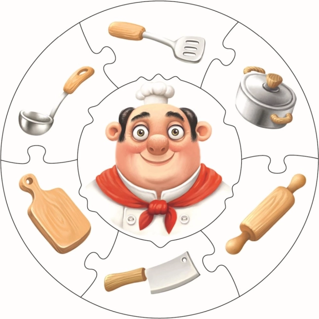 Ilustrace kuchaře s náčiním (vařečka, hrnec, váleček) napomáhá rozvoji logiky a poznávání každodenních činností.