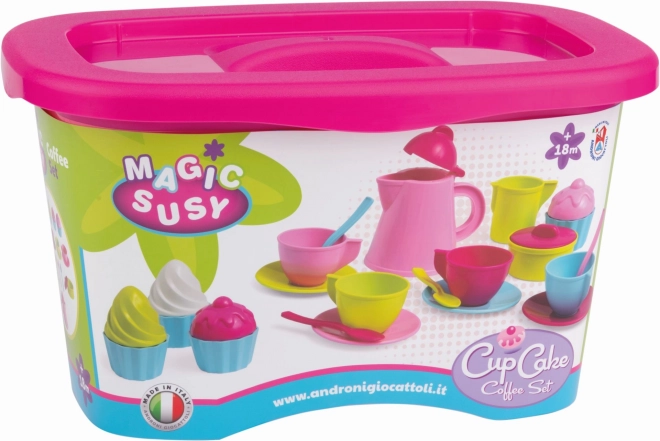 Stylový kávový set od značky Androni promění každou dětskou kuchyňku v malou kavárnu. Sada obsahuje vše pro hraní na baristu – od konvičky a hrnečků až po roztomilé cupcaky – a je vyrobena z kvalitních, pevných a pružných plastů v Itálii. Díky 24 dílům, praktickému úložnému boxu s víkem a bezpečnému provedení je ideální pro děti od 18 měsíců i do mateřských školek.