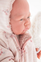 Jemně vykreslené vlásky, žilky, nehtíky a obočí vytvářejí autentický vzhled novorozence. Speciální úprava pokožky působí přirozeně a jemně na dotek.