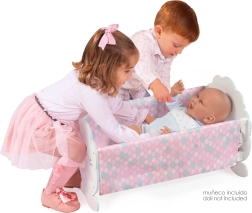 Roztomilá dřevěná kolébka pro panenky z kolekce OCEAN FANTASY okouzlí jemnými pastelovými barvami a motivem malé mořské víly. Nabízí kvalitní zpracování, stabilní konstrukci a španělský design. Součástí je růžový polštářek, který doplní pohodlí panenky. Ideální doplněk do dívčího pokojíčku pro kreativní hraní a pečování o panenky.