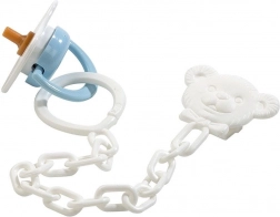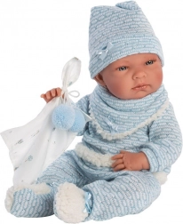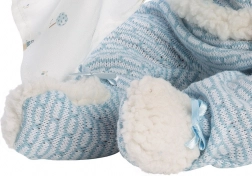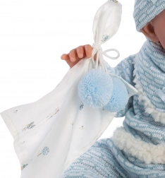 Kromě módní modré dečky s ušima, která ladí s jeho oblečením, je součástí výbavy také dekorativní dudlík. Panenka je zabalena v atraktivním dárkovém balení, který napodobuje dům značky Llorens.