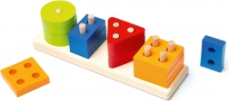 Tato kvalitní dřevěná skládačka nabízí 16 barevných geometrických tvarů, které se navlékají na kolíčky na obdélníkové základně. Děti se při hře učí rozpoznávat barvy a tvary, zkouší různé kombinace a přirozeně trénují koordinaci i trpělivost.