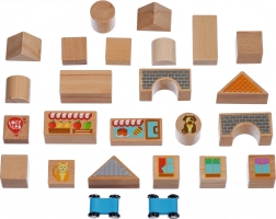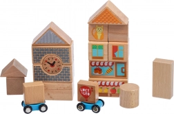 Sestavte vlastní malebné městečko z pečlivě zpracovaných dřevěných kostek a vydejte se na výlet s dvěma malými autíčky. Díly různých tvarů – kvádry, trojúhelníky, válce i můstky – se skvěle kombinují a motivují děti ke kreativnímu stavění i k volné hře.
