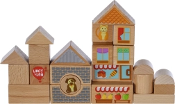 Barevné potisky s motivy zvířátek, výloh, oken a střech dodávají stavbám příběh a učí děti vnímat detaily. Po skončení hry lze všechny díly jednoduše uložit do odolného kulatého boxu s uzavíratelným víkem a madlem, který usnadňuje přenášení i skladování.