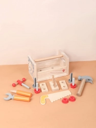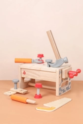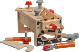 Součástí setu je rozmanité dětské nářadí: kladivo, pilka, šroubovák, klíč, šrouby a matky, svěrák a hladké dřevěné dílky s otvory. Vše má své místo, takže se děti učí pořádek i základní techniky práce se spojovacím materiálem. Hra podporuje kreativní stavební hry, koordinaci oko–ruka a trpělivost.
