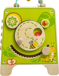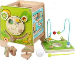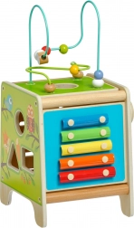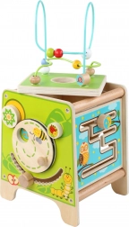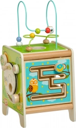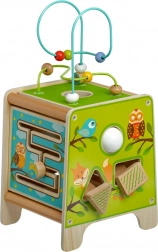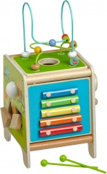 Tato barevná dřevěná aktivní kostka přináší dětem hodiny smysluplné hry. Vrchní korálkový labyrint lze vyjmout a otočit dovnitř kostky pro snadné uložení. Na bočních stranách děti objeví xylofon s paličkami, vkládačku dvoudílných rotačních geometrických tvarů, motorické bludiště, rotující kolečko, otočné prvky a zábavnou hru s přesouváním kolíčku v drážce.