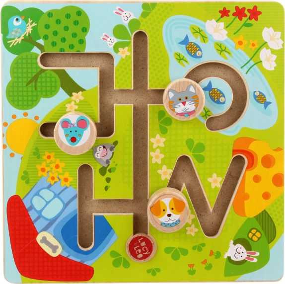 Dřevěný labyrint Slunné údolí přináší dětem radost z objevování i učení. Ilustrovaná hrací deska s rybníkem a zelení vtáhne děti do hry, kde pes, kočka a myška putují ke svým cílům. Díky plynulým drážkám se figurky snadno posouvají a hra je tak bezpečná a intuitivní.
