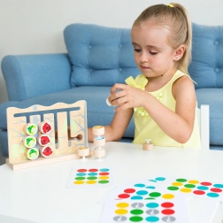 Součástí je 6 oboustranných karet s barevnými vzory. Děti podle nich umísťují kolíčky do správných pozic a rozvíjejí logické uvažování.