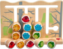 Objevte zábavnou dřevěnou motorickou hru Lucy & Leo, která rozvíjí jemnou motoriku, logické myšlení a rozpoznávání barev. Děti posouvají barevné ptáky a kočky ve štěrbinách podle přiložených karet s předlohami – učení se tak stává hrou.