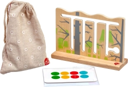Tato kvalitní dřevěná hra nabízí intuitivní posouvání barevných kolíčků se zvířátky po vyfrézovaných drážkách. Díky 6 oboustranným kartám s předlohami děti procvičují koordinaci oko–ruka, trpělivost a koncentraci. Po skončení hraní lze všechny dílky snadno uklidit do lněného sáčku.