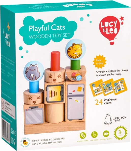 Odolné dřevěné tvary s jemně broušeným povrchem a ilustrovanými motivy kočiček a předmětů. Ideální pro malé dětské ruce.