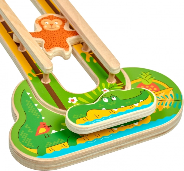 Objevte chytrou a poutavou hračku se svěžím motivem džungle, která zabaví děti na dlouhé minuty. Po zavěšení na zeď šetří prostor v dětském pokoji a vytváří atraktivní herní zónu. Dvě dřevěné opičky se spouštějí po dvojité dráze, přemetají se a otáčejí, takže každé svezení je zábavné a jiné.