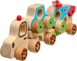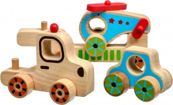 Tato dřevěná skládačka pro nejmenší spojuje zábavu s učením. Děti mohou samostatně jezdit s kamionem, autíčkem i vrtulníkem a poté je všechny naložit na korbu a vyrazit „na cestu“. Barevné akcenty a jednoduché tvary pomáhají rozvíjet zrakové vnímání, zatímco manipulace s díly trénuje úchop a obratnost.