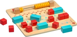 Dřevěná vzdělávací sada pro první krůčky v matematice od LUCY & LEO rozvíjí logiku, počítání a jemnou motoriku formou hry. Obsahuje hladkou dřevěnou desku s počítadlem a drážkami pro kostky, 10 červených kostiček a 5 modrých kvádrů pro základy sčítání a odčítání. Bezpečné provedení a odolné materiály jsou ideální pro děti od 3 let.
