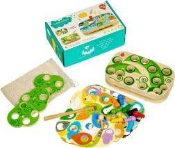 Zábavná a vzdělávací hra Lucy & Leo chytání housenek rozvíjí jemnou motoriku, logické myšlení a koordinaci oko–ruka. Pomocí magnetické hůlky děti chytají barevné housenky do otvorů v dřevěné desce a zkouší různé úrovně obtížnosti s vyměnitelnými předlohami a otáčivými listy.