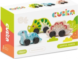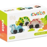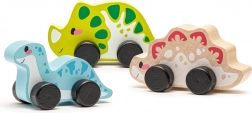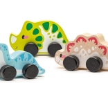 Set obsahuje tři dřevěné dinosaury s kolečky pro snadný pohyb, ideální pro malé děti.
