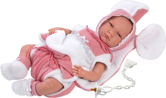 Stylový 3dílný obleček pro panenku NEW BORN od značky Llorens ve velikosti 40–42 cm potěší každou malou pečovatelku. Sada zahrnuje sladěné kousky a ozdobnou podložku s oušky, je vyrobená ve Španělsku a dodávána v praktickém obalu na ramínku. Ideální pro kreativní hru a převlékání panenek od 3 let.