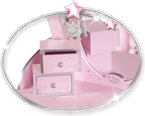 Nabízí dva šuplíčky pro uložení doplňků a zrcadlo, což usnadňuje hru na oblékání.