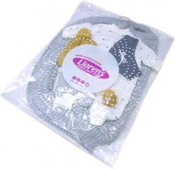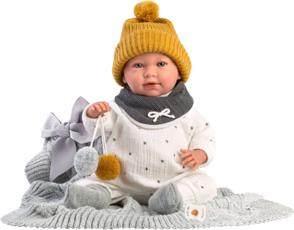 4dílný obleček s ozdobnou dečkou s mašličkou a bambulkami na hraní pro panenku miminko NEW BORN Llorens velikosti 40-42 cm. Vyrobeno ve Španělsku, baleno v igelitovém obalu s plastovým nebo kartonovým ramínkem. Doporučený věk od 3 let.