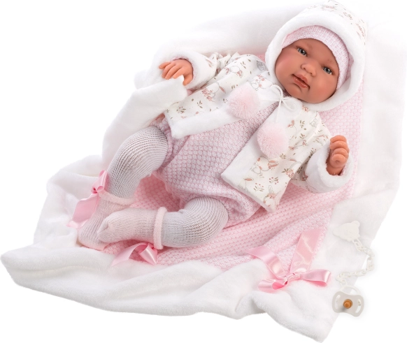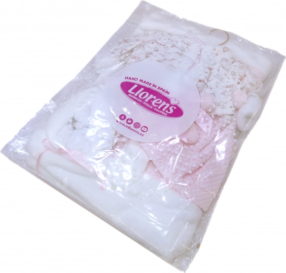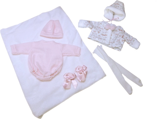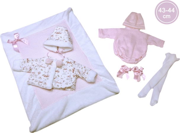 6dílný obleček s ozdobnou fleecovou oboustrannou dečkou s mašličkou pro panenku miminko NEW BORN Llorens velikosti 43-44 cm. Vyrobeno ve Španělsku, baleno v igelitovém obalu s plastovým nebo kartonovým ramínkem. Doporučený věk od 3 let.