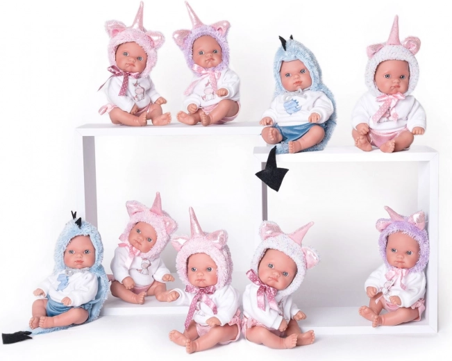Mazlivý bílý obleček s růžovými detaily, oušky a rohem podporuje fantazii a dělá z panenky kouzelného parťáka pro každodenní hraní.