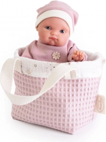 Součástí balení je stylový textilní košík/taška pro snadné nošení a ukládání panenky. Značka Antonio Juan klade důraz na udržitelnost – u vybraných modelů používá organickou bavlnu bez chemického ošetření. Panenka je prezentována v elegantní dárkové krabici, takže potěší při každé příležitosti.