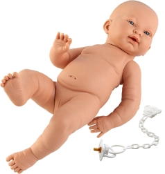 Miminko bez zvuku s vinylovým tělem s možností koupání, na kterém je zachycen doslova každý detail dětského tělíčka včetně roztomilých miminkovských faldíků a pohlaví. Miminko na rozdíl od jiných modelů nemá řasy. Ruce a nohy jsou k tělu přichycené kloubem. Miminko je polohovací a může i sedět. Dudlík v balení slouží pouze jako doplněk. Tento model patří do etnologické kolekce "lidské rasy" a představuje bílou rasu. Velikost 45 cm. Ručně vyrobeno ve Španělsku, baleno v igelitovém obalu. Doporučený věk od 3 let.