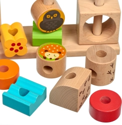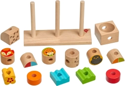Stabilní podstava a tři kolíky usnadňují správné řazení dílků. Děti trénují jemnou motoriku a koordinaci ruka–oko při navlékání a skládání.